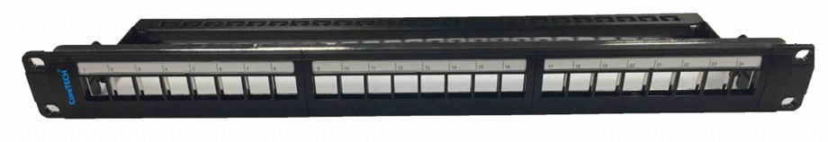 The 24-port unloaded patch panel supports the installation of Cat6A shielded keystone jacks and complies with TIA/EIA-568 Cat6A standards, suitable for 10-Gigabit Ethernet applications. It is designed for the interconnection and termination of horizontal cabling between devices, equipment, and centralized points, and fits standard 19″ equipment racks and cabinets.